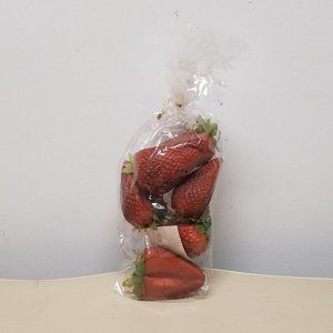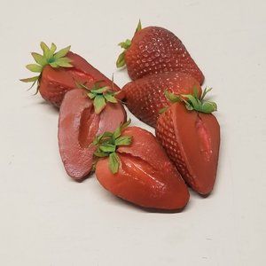 This set of 8 faux strawberries will infuse your decor with a burst of color! There are six half strawberries and two full strawberries. They are life-sized, and bring a touch of realism to any display. These leaves have a more artifial look. Made from high-quality materials, these durable strawberries will maintain their vibrant appearance over time, making them a versatile and long-lasting addition to your home or event decor. Whether used as part of a kitchen arrangement, table centerpiece, or creative project, these strawberries are sure to captivate attention!