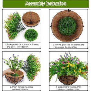 🧿【Hanging Planter with Fake Flowers Kit】This hanging basket with artificial flowers plants includes 1 pcs coconut lining chain hanging plant basket, 7 pcs artificial flowers, 4 pcs green boston fern, semi-circular plastic grass.