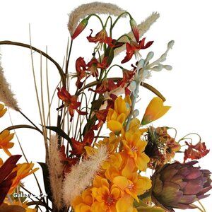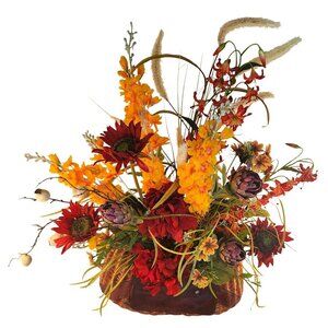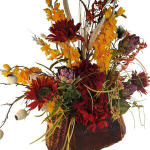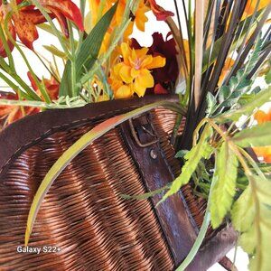 A vibrant centerpiece combining lifelike flowers and a rustic vintage fishing creel basket with leather accents. Perfect for adding elegance and warmth to any room.