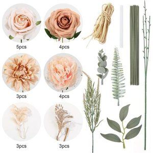 🧿PACKAGE INCLUDE:Light pink rose X5,Champagne rose X4,Light orange dahlia X3,Light pink peony flower X4,Pine grass X6.Each flower box comes with at least 15 leaves of different styles. 20 10'' bendable plant stalks for DIY. A glue stick for sticking flower sticks. A three-pronged soft pole for inserting leaves. A bundle of raffia.