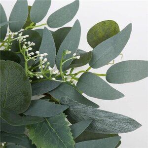 🧿Artificial Eucalyptus Wreath:This lovely wreath is handmade with fake green eucalyptus leaves and clusters of white flowers on a wired iron ring.It looks very realistic and eye-catching.