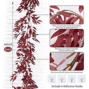 🧿Willow Leaves Fall Garland Size:Package contains 2 pieces of Burgundy artificial willow vine each about 67 inches long, leaf size 2.5 inches (L) x 0.7 inches (W), an artificial willow vine on about 70 leaves