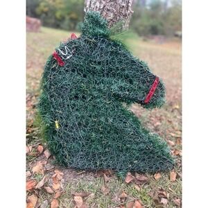 Artificial Pine Horse Head Animal Farmhouse Christmas Wreath. Approximately 23" Tall X 20" Wide. Artificial Pine was attached to a chicken wire mesh frame to give it stance to stand firmly upright. These go for $150-$250 on Etsy. Would look awesome on a gate entryway, on a barn, shop or a mantlepiece!