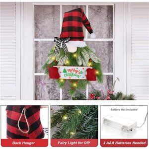-【Wreath with Swedish Tomte Gnome】 The gnome hat made of plaid fabric, the greenery is lifelike with artificial pine and the Merry Christmas sign is felt touch. There is a twine hanger on the back. Adorning your door with this lighted Christmas wreath