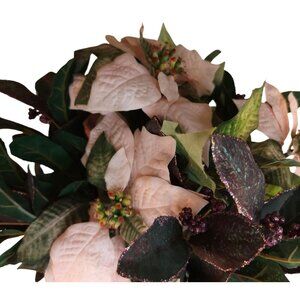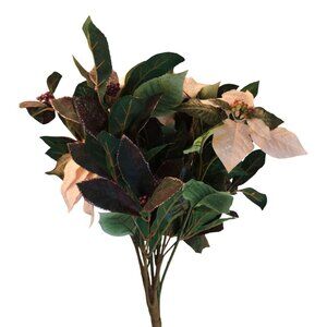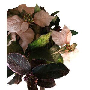 This artificial pink poinsettia bouquet blends elegance with versatile home decor. Soft pink poinsettia flowers feature realistic details and are complemented by glitter-tipped dark green and burgundy leaves for a festive and stylish aesthetic. The bouquet includes purple faux berries for added depth and texture, making it a charming accent for the holiday season or year-round decorative use. Crafted with high-quality materials, the bouquet ensures lasting beauty with no maintenance required. Light yet sturdy, this arrangement seamlessly enhances any space and fits easily into vases of various sizes. *Vase is not included.