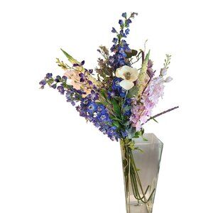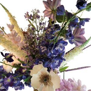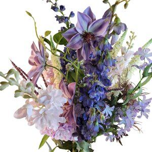 This exquisite hand-tied artificial flower bouquet features a delightful mix of purple, lavender, and soft cream blooms. Meticulously crafted, each flower is designed for a realistic appearance and long-lasting beauty. The floral arrangement includes a variety of blossoms, from deep purple delphiniums to soft lavender accents, complemented by delicate greenery. A perfect addition to home decor, weddings, or special occasions.  Height 30-36 stems are not cut so you can put them in your own vase.