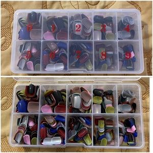 Mixed variety; French tip, white, light brown/tan a few metallic pink. A container of mixed colors and sizes.