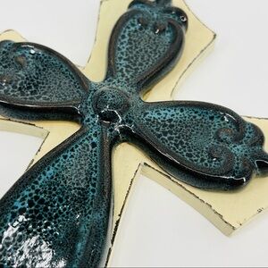 Beautiful Artisan 3D Layered Ceramic & White Washed Wood Crucifix in Emerald Green ceramic Cross. A Wall Hanging 9x7” Christian Cross.