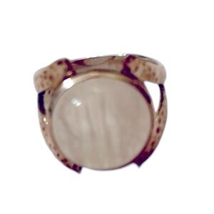 Stunning Artisan ring with a hammered sterling silver band and round white translucent moonstone quartz stone. Marked 925. Perfect for any occasion.