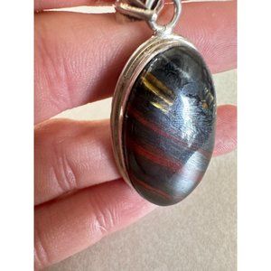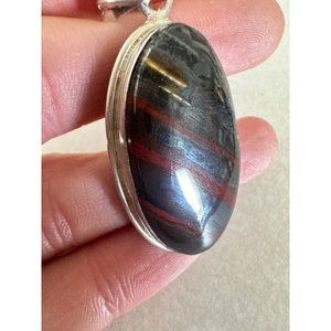 Excellent condition, shows minor tarnishing. Semiprecious iron tiger's eye actually consists of banded layers of multiple stones: Hematite, Red Jasper, and Tiger Eye, and because of the presence of iron, is magnetic while the solid sterling silver frame is not. Oval cabochon appears black, silver, red, and vibrant gold. Please see photos for measurements.