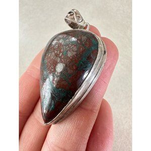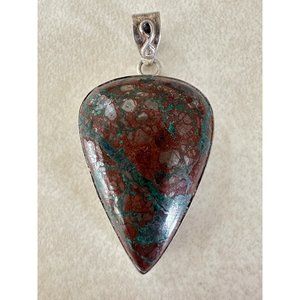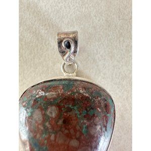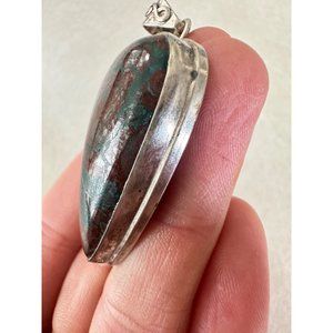 Excellent condition, shows minor tarnishing. Semiprecious sonora sunrise (or sunset) chrysocolla is a natural swirled mix os deep burgundy reds and vibrant teal-tinted blues and is set into a solid sterling silver frame with a textured bail. Please see photos for measurements.