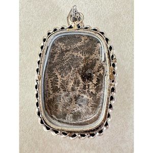 Excellent condition, no flaws. Semiprecious jasper is set into a twisted frame with a textured bail. Please see photos for measurements.