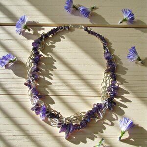 Tumbled Amethyst is as the core of this moment. These natural stones are entwined with three strands of artisan sterling silver links. This is a matinee length Amethyst necklace, meaning that the length is approximately 24 inches including the custom sterling clasp. The photos include two AI images, showing the necklace on virtual models.