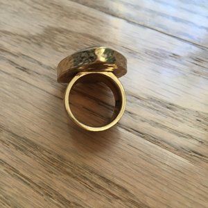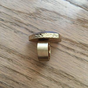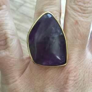 Thick band, gold tone, large amethyst. If I had to guess, I would guess 16-22 carat weight for the stone. Unusual shape. Size 6 but fits tight because of the thick band. There is an inscription inside the ring but it's very worn off. Not sure of metal type