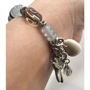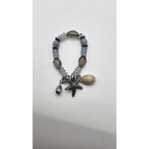 Materials: acrylic beads, cowrie shells, starfish charm Length:6.5in Clasp: slide on stretchy Signed? no Excellent vintage condition