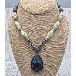 Artisan Black & Green Bead & Faux Paper Collar Teardrop Pendant Necklace 16"