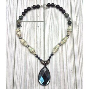 Artisan Black & Green Bead & Faux Paper Collar Teardrop Pendant Necklace 16"