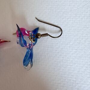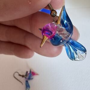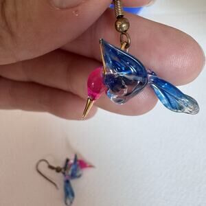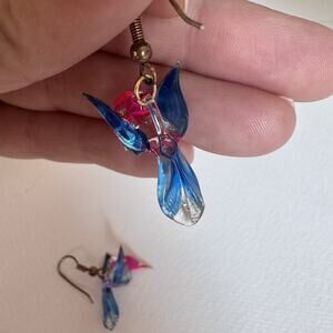 Artisan Blown Glass Blue Pink Hummingbird Earrings gold tone Hardware