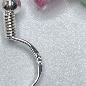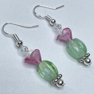 Artisan Boho Pink Green Flower Beaded Silver Tone Dangle Earrings Cute