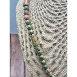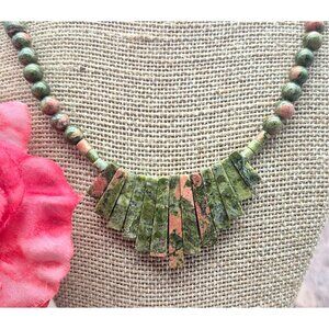 This stunning artisan necklace features Unakite natural stone beads in green and pink hues. The collar bib design with a toggle clasp adds a boho touch to any outfit, perfect for many occasions.