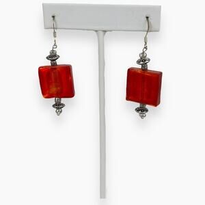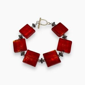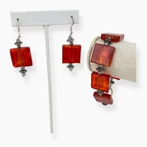 Artisan Bracelet Pierced Dangle Earrings Red Acrylic Square Links Silver Tone
