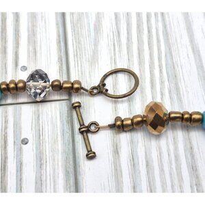Elevate your style with this stunning artisan-made jewelry set featuring a bronze bead and howlite faux turquoise stone collar necklace and drop earrings. Perfect for any occasion. Necklace Measures 23" and the Earrings are 2" long.
