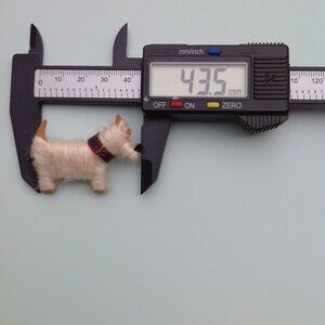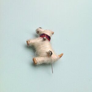 Delightful Handcrafted Scottish Terrier Brooch. Shetland wool wound on wooden frame. Scottish Plaid fabric at neck. Fun, original, one of a kind. Measurements in photos.