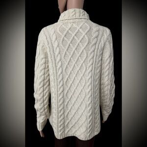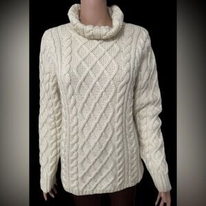Keywords: Artisan sweater, women's pullover, ivory sweater, cable knit, cowl neck, wool sweater, long sleeve, casual wear, cozy sweater, pre-owned.
