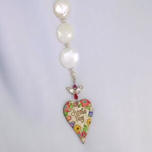 This unique piece features a beautiful hand crafted colorful ceramic heart paired with elegant vintage flat Mother of Pearl beads and sparkling crystals. The 'Choose Joy' detail serves as a lovely reminder to embrace positivity every day.