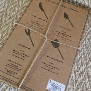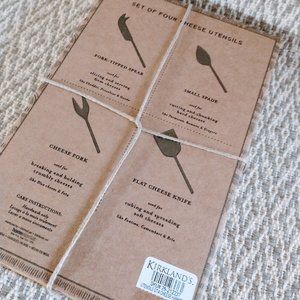 The Artisan Market boxed set of 4 Cheese Utensils. Fork tipped spear for slicing and serving firm cheese. Flat cheese knife for cubing and spreading soft cheese. Cheese fork for breaking and holding crumbled cheese and small spade for cutting and chunking hard cheese. Made in India. Box is 10.25 x 6.75. new condition.