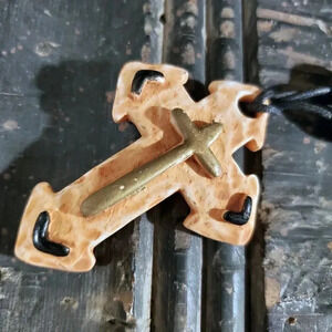 Artisan Christian Cross Unglazed Clay Lt Sienna Multicolor OOAK Pendant Necklace