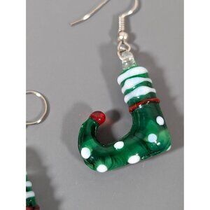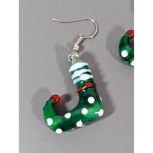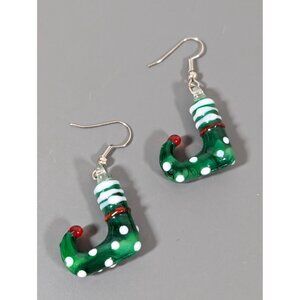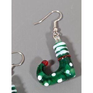 Add a festive touch to your holiday outfit with these charming artisan Christmas elf earrings. Made from high-quality glass, these dangle earrings feature a delightful green and white polka dot design, perfect for any Christmas celebration. Lightweight and comfortable for all-day wear.