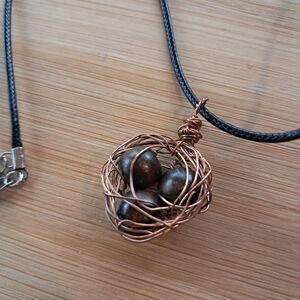 Discover the beauty of this artisan necklace featuring a copper wire-wrapped pendant with wood beads. The intricate design adds a unique touch to your style.