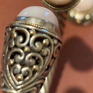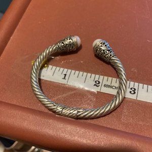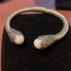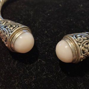 Artisan crafted 18k & sterling silver gemstone cable hinged cuff and necklace with gemstone pendant. Both pieces are marked 18k, 925 and Indonesia. I think the pink gemstone is pink opal or pink quartzite. Not sure, there is 18k going around the gemstone plus small beads going around gemstone. The cuff is about 6 1/2 inches. It is very easy to get on and off. The chain is 17 1/2 inches and the pendant is 1 3/8 inches by 3/4 inches. This is a really nice set