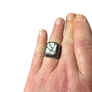 This stunning artisan-crafted ring features a beautiful white buffalo cabochon set in ornate sterling silver. The rectangular stone measures 11.6mm wide by 17.7mm long and boasts a unique white and black coloration. With a total carat weight of 14.2 carats, this cocktail ring is the perfect statement piece for any man's collection.
