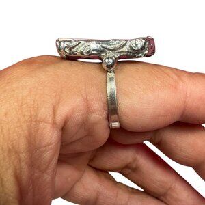 This enchanting ring weaves a tale of artistry and upcycling. Featuring a Wedgewood Peter Rabbit broken china design, set in a boho silver-blend bezel and crafted with a repurposed silver spoon bowl band, it’s a timeless keepsake of charm and creativity. • Wedgewood Peter Rabbit design • Repurposed silver spoon band • Boho silver-blend bezel detail • Broken china centerpiece • Size 9 USA Pre-owned, good condition, light wear on the silver band. Top to bottom = 1 inch Width: .75 inches.