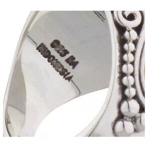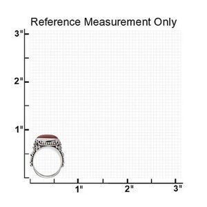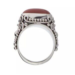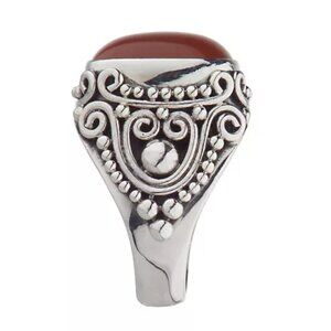 This boldly impactful ring immediately draws attention with its cushion-shaped, bezel-set red jasper cabochon. Ornate, oxidized beaded and scroll designs around the gallery and shoulders invite the eyes to linger while speaking volumes about the artisan's exotic influences and exquisite craftsmanship.