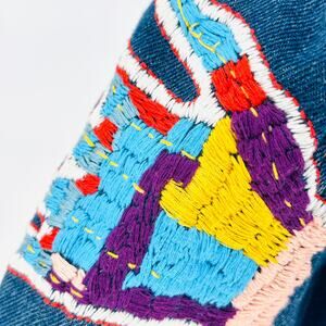 Artisan Denim Blue Boho Embroidered Spanish Script Bell Sleeve Jacket