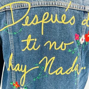 Excellent condition. Button front, chest flap pockets, wide bell sleeves with multicolor hand embroidery and back Spanish script “Despues de ti no hay nada.” 100% cotton.
