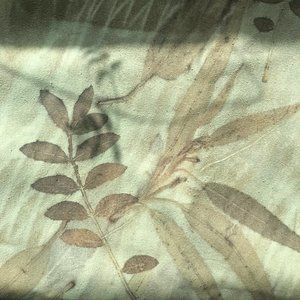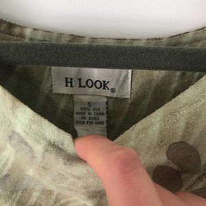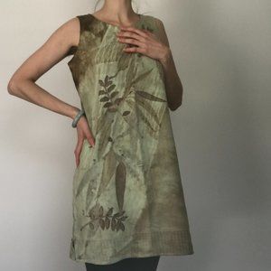 Beautiful artisan dyed green/ brown sheath / shift dress. Lovely botanical print of leaves. Brand is H Look and is 100% silk.