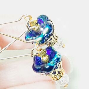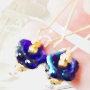 Artisan Earrings 043L# Flower basket Victorian gold filigree Cobalt Glass