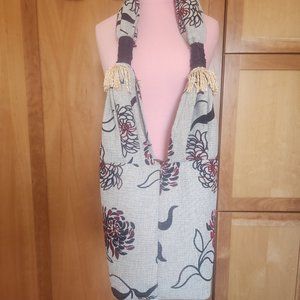 Flocked tweed fabric with embroidery, fabric flowers, hand wrapped straps with gold fringe.