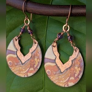 Copper Wrapped Amethyst Earrings Showcasing Artisan Enameled Copper Charms.