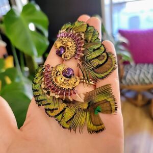 Artisan Filgree Ashlock Peacock Feather Amethyst 23k Gold Plated Earrings