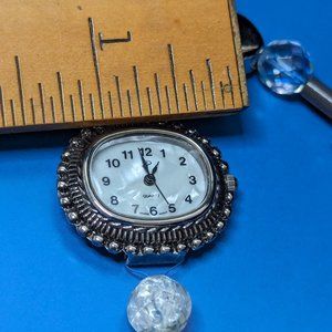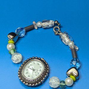 Bracelet, Watch Quartz, Beads goes from 12mm Round up to 4/8" aprox with Silver Inside Glass Venetian Barrel Beads, with Green Glass Beads, Fx Pearls and Silver Tone Lobster Clasp.