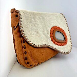 The flap closure is secured with a magnetic snap, and the interior is unlined leather for an authentically rustic and tactile finish. A beautiful blend of Southwest, boho, and folk art style, this one-of-a-kind piece is both wearable and collectible.