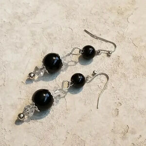 Artisan Glossy Black Glass Pearl Clear Crystal Silver Plated Dangle Earrings