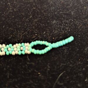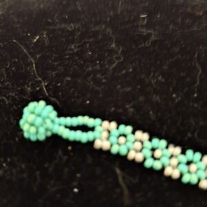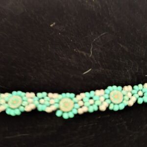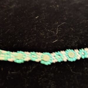 This appears to be a handmade piece with blue and white seed beads forming a floral motif. This is unique and has a flower power look to it. It is 7.5" long and in very good pre-owned condition.