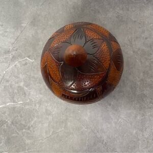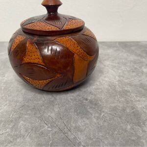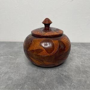 This exquisite handcrafted wooden art bowl features a rich brown finish, perfect for adding a touch of elegance to your home decor. Its unique design makes it a standout piece in any room. This unique wooden jar is a must-have for collectors and enthusiasts alike. Crafted by hand, this vintage piece features a lid and is perfect for storing small items. The jar is made of high-quality wood and has a rustic charm that will complement any decor. This piece is perfect for those who appreciate handmade and hand-turned items. Add it to your collection or use it to enhance your home decor. Small art bowl- 4 inches tall and 4 inches wide.