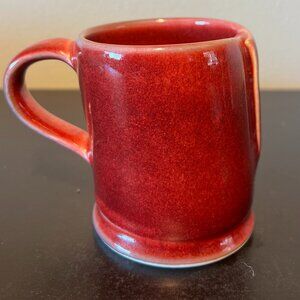 Artisan handcrafted pottery mug features a glossy cranberry red glaze with gray accents Its unique folded wall with an overlap detail gives it a distinctive look and shape. A true work of art. Unglazed bottom. Measures 4” tall with a 3” diameter; 4.5” across including handle. Holds 10 fluid oz.